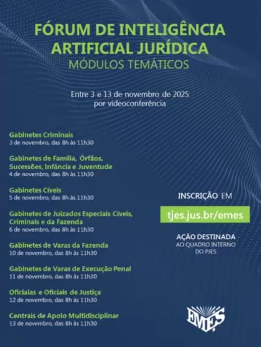Nesta semana aconteceu o primeiro Fórum de Inteligência Artificial Jurídica, com Módulos Temáticos, promovido pelo Tribunal de Justiça do Estado do Espírito Santo (TJES) e a Escola da Magistratura do Estado do Espírito Santo (Emes) como ação destinada ao quadro interno do Poder Judiciário do Espírito Santo (PJES). Na manhã de quarta-feira (12/11), o evento on-line foi realizado de forma direcionada para a categoria dos Oficiais de Justiça, de 8h as 11h30, com a participação da Diretoria do SINDIOFICIAIS-ES e a presença de mais de 160 Oficiais.