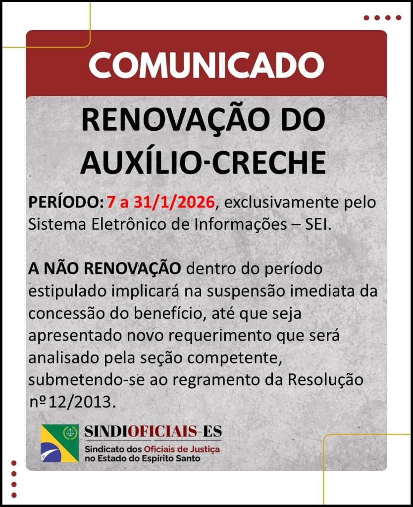 Esta semana, a Secretaria de Gestão de Pessoas (SGP) do Tribunal de Justiça do Espírito Santo (TJES) convocou os servidores do Poder Judiciário para efetuarem a renovação do auxílio-creche no exercício de 2026. Para isso, o SINDIOFICIAIS-ES alerta que os Oficiais de Justiça devem ficar atentos aos requisitos e procedimentos dessa renovação, ao fato de que ela só é válida pelo Sistema Eletrônico de Informações (SEI), mas, em especial, ao prazo estipulado – período de 7 a 31 de janeiro de 2026. Alguns requisitos e procedimentos precisam ser observados para a solicitação do auxílio-creche deste ano.
