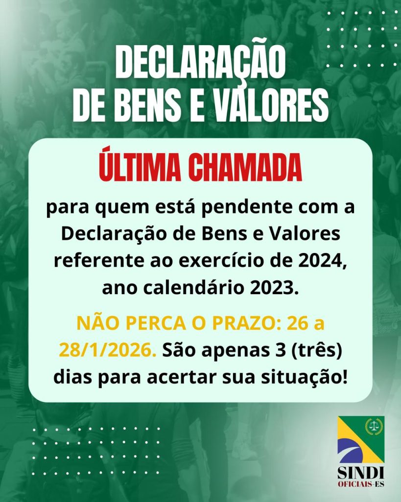 O SINDIOFICIAIS-ES alerta que o Tribunal de Justiça do Espírito Santo (TJES) convocou hoje (23/1), em última chamada, todos os servidores do Poder Judiciário do Espírito Santo (PJES), que ainda não realizaram a entrega da Declaração de Bens e Valores referente ao exercício de 2024, seguindo a recomendação nº 10/2013 do Conselho Nacional de Justiça (CNJ). Os servidores que ainda estão com essa pendência precisam apresentar os documentos no prazo improrrogável de três (3) dias, isto é, no período de segunda-feira (26/1) até a próxima quarta-feira, dia 28 de janeiro de 2026, quando encerra o prazo final, sob pena de incorrerem nas sanções previstas em Lei.