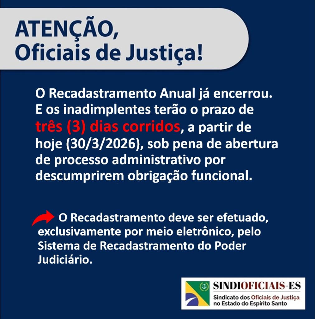 O Tribunal de Justiça do Espírito Santo (TJES) publicou no Diário da Justiça Eletrônico (e-diário) de hoje (30/3) a convocação dos inadimplentes no Recadastramento Anual deste ano para todos os magistrados e servidores ativos do Poder Judiciário do Espírito Santo (PJES). A publicação indica que mesmo após a prorrogação do prazo inicial, que foi disponibilizada no e-diário do dia 11 de março, ainda há servidores em atraso. O Recadastramento deve ser realizado no prazo de três (3) dias corridos, contados a partir desta segunda-feira (30/3/2026), sob pena de abertura de processo administrativo por descumprimento de obrigação funcional.